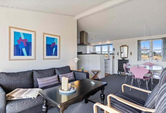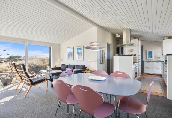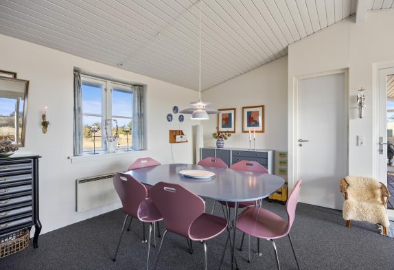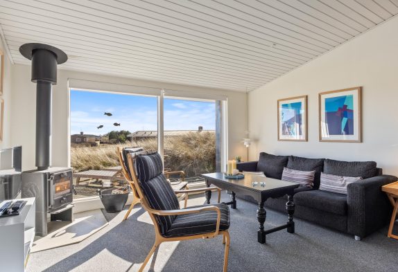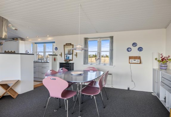 Nyd den afslappende atmosfære dette sommerhus byder på. Om det er i det dejlige rummelige køkkenalrum med et lækkert måltid, et brætspil eller et tv-program på husets fladsskærms-tv. I Køkkenalrummet vil I også møde den skønne brændeovn, som altid kan give lidt ekstra varme eller de hyggelige knitrende lyde, som er medvirkende til en hyggelig og klassisk sommerhusstemning.
