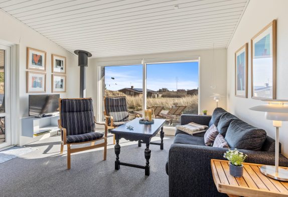 Fra køkkenalrummet er der også direkte adgang til den afskærmede og overdækkede terrasse, så I kan nyde dagens første kop kaffe i selskab med dagens første solstråler. Hvis det er lidt køligere udenfor, kan du også nyde den dejlige udsigt fra stuens store vinduer.