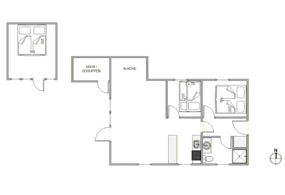 Fra opholdsrummet er der adgang til de to værelser; forældresoveværelset med dobbeltseng og det andet værelse, hvor der er køjeseng, som feriens mindste gæster helt sikkert vil nyde. Udenfor er et fint anneks med to sovepladser. Dette er perfekt, hvis I har teenagere med på ferien, da de helt sikkert vil nyde at have deres eget lille sommerhus.