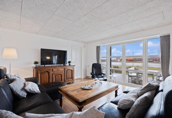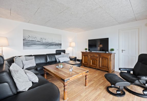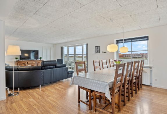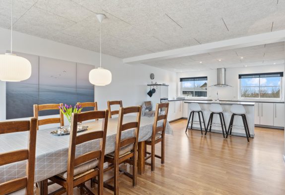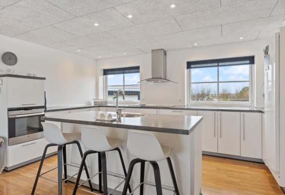 Det lyse og rummelige sommerhus på Skolegade 11 danner rammen for en fantastisk ferie på Vestkysten. Sommerhusets stue og køkken ligger i forlængelse af hinanden, hvorfra nogle af jer har mulighed for at slænge jer i den store sofa eller nyde en kold drink ved kogeøen, imens andre står for madlavningen i det flotte og indbydende køkken. Fra køkkenalrummet kan I nyde den smukke panoramaudsigt ud over kanalen med de forbi sejlende både, og herfra har I yderligere direkte adgang ud til en af terrasserne.
