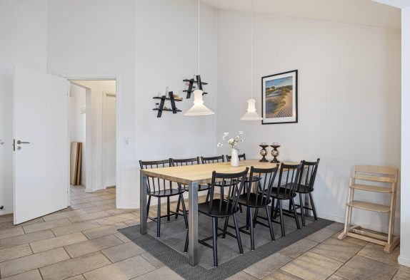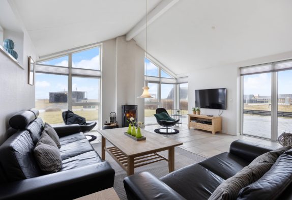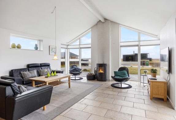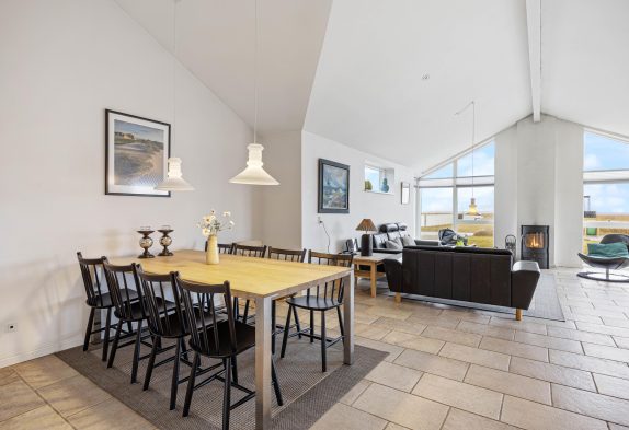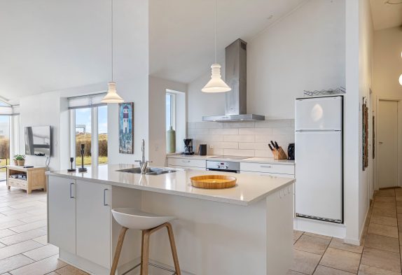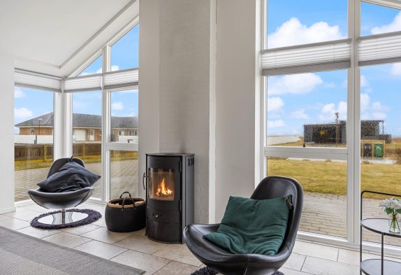 I køkkenalrummet findes alle moderne faciliteter, som gør det nemt at lave et dejligt måltid, smide opvasken i maskinen og nyde en drink på siddepladserne oppe ved køkkenøen. På de kolde dage kan man krybe sammen i sofaen, se en god film og nyde varmen fra brændeovnen. Samt de lune gulve fra gulvvarmen, som sikrer varme fødder. Alt imens man kan følge vejrets gang igennem de store panoramavinduer.