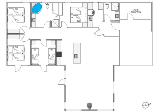 Sommerhuset har 4 soverum, heraf 3 med dobbeltsenge og 1 med enkeltsenge. Begge badeværelser har gulvvarme og på det store badeværelse er der både spabad og sauna, så I rigtigt kan få slappet af på ferien og få ladt batterierne op, mens I nyder lidt wellness.