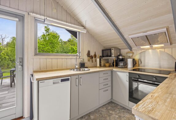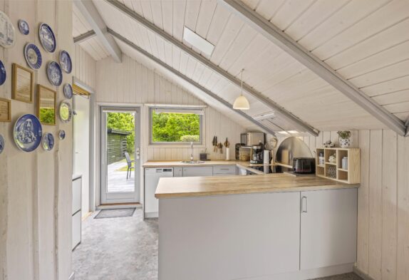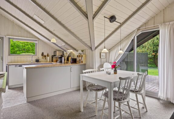 Dette hyggelige sommerhus er indrettet med 2 soverum. Det ene værelse er udstyret med dobbeltseng og det andet har to enkeltsenge. Begge værelser har adgang til stuen, som ligger i åben forbindelse med køkkenet, som har opvaskemaskine. Når vejret ikke indbyder til eventyr i området, kan I hygge jer i stuen med brætspil, puslespil, en god bog, eller hvad der nu interesserer jer. Fra stuen kan I gå direkte ud på terrassen, hvilket er enormt praktisk, hvis I har hundene med. I kan blot åbne terrassedørene og lade jeres firbenede venner løbe frit på den store, indhegnede grund.