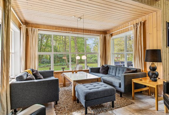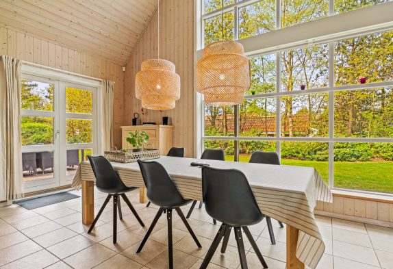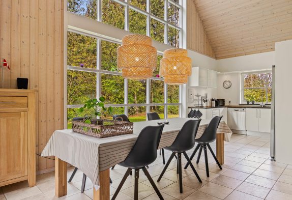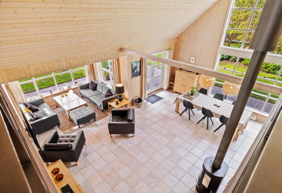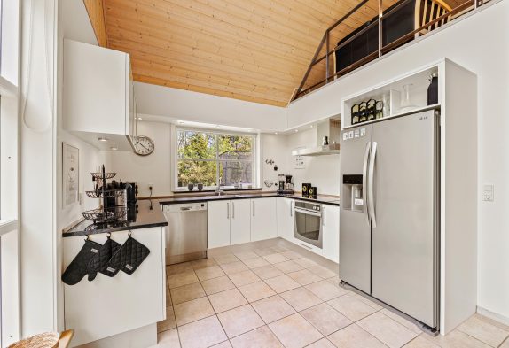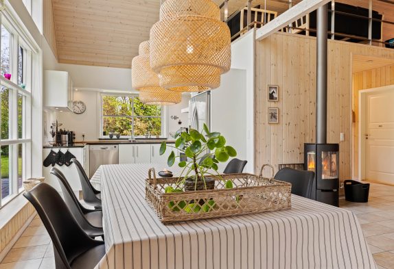 Det store fællesrum samler både køkken, spisestue og stue. Det veludstyrede køkken har mange lækre og praktiske fordele, så som opvaskemaskine og amerikanerkøleskab, så der er altid iskoldt vand. Stuen byder op til hygge, hvad enten I nu er til kort- og brætspil foran den knitrende brændeovn, eller måske foretrækker I at smide jer på en af sofaerne og se en god film via sommerhusets Chromecast.