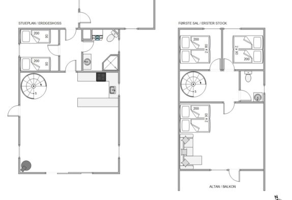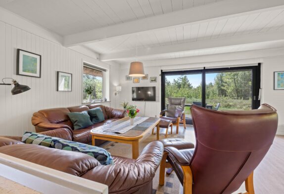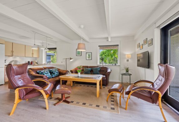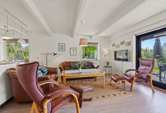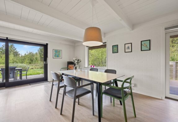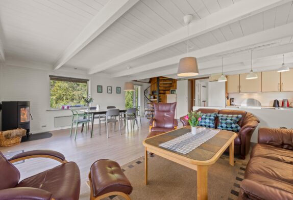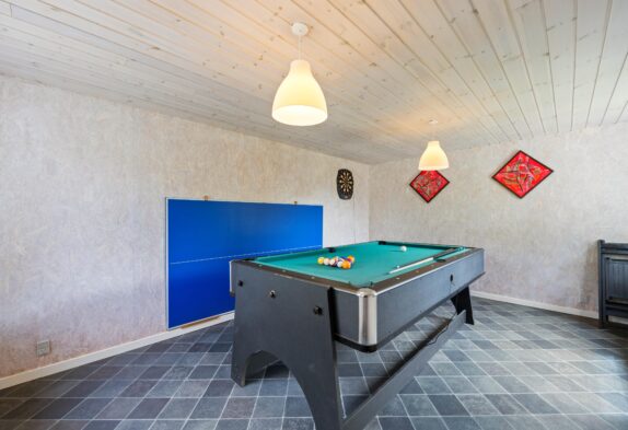 Sommerhusets hjerte er stuen med spiseplads og køkken i ét. Her kan I tilbringe mange hyggelige timer foran den knitrende ild i brændeovnen, især om aftenen eller på køligere dage. Er I til mere aktivitet – eller skal I have afgjort en konkurrence, er der et poolbord til rådighed i aktivitetsrummet. De 4 soveværelser er alle indrettet med dobbeltsenge. Sovesofaen i det store værelse ovenpå giver plads til 2 personer ekstra. Der er også udgang til en bred altan, hvorfra I særligt kan nyde udsigten. Der er både et badeværelse og et gæstetoilet i feriehuset, begge med gulvvarme.