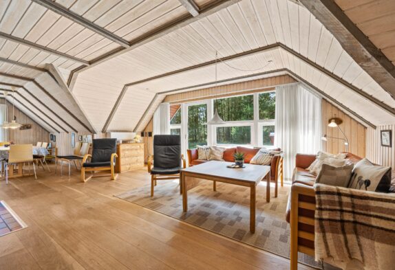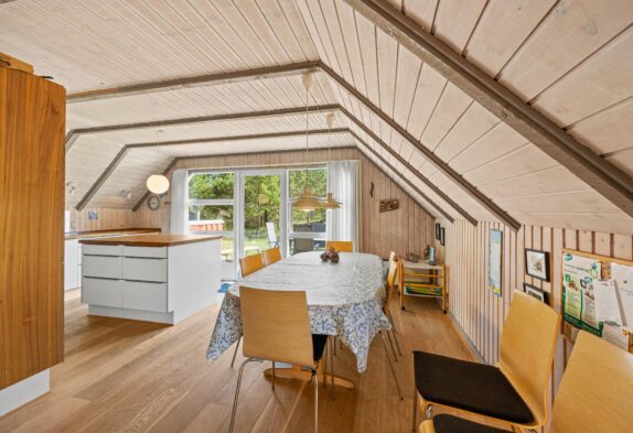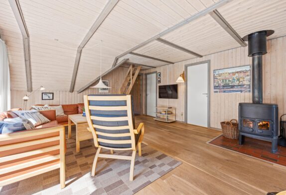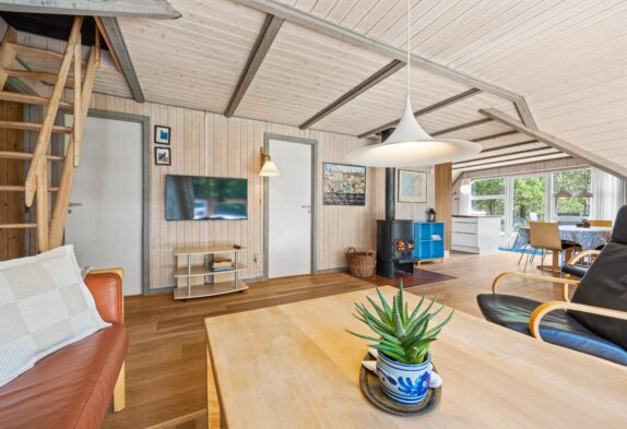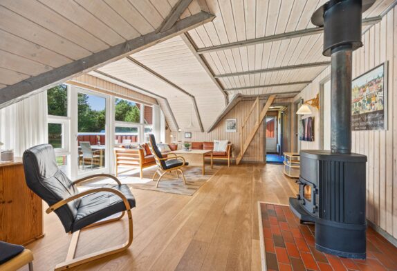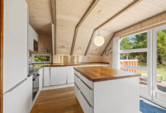 Efter entréen kommer I ind i opholdsstuen, som er indrettet med et lysgivende vinduesparti. Sammen med det lyse træ og de lave lofter får det jer hurtigt til at føle jer hjemme. Her kan I slappe af i sofaen, nyde et godt glas vin og lytte til knitren fra brændeovnen. Om aftenen kan I lave mad sammen i det moderne og veludstyrede køkken.