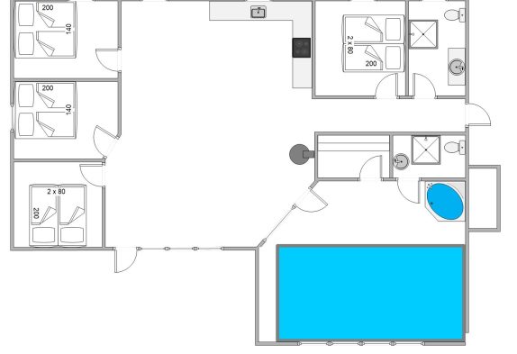I feriehuset finder I hele 2 badeværelser, hvoraf det ene ligger i forbindelse med poolrummet. Der er gulvvarme på badeværelserne, og desuden er der både vaskemaskine og tørretumbler i sommerhuset.