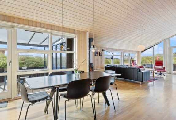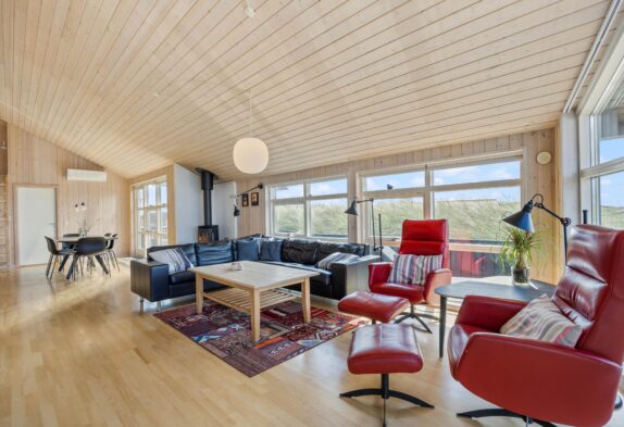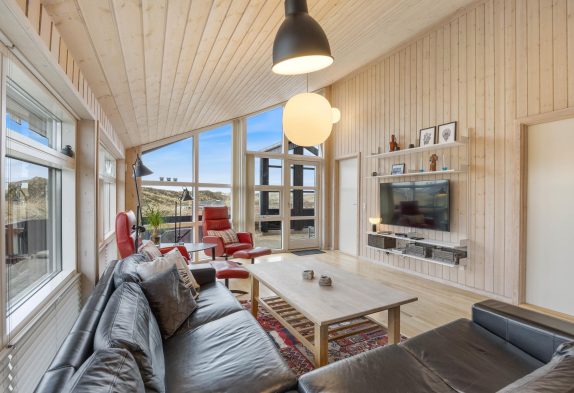 I tv-stuen kan du slappe af på sofaerne eller i de komfortable lænestole. Her kan du se dine yndlingsfilm eller serier på det store faldskærms-tv, eller bare slappe af og nyde en god bog. Alrummet har et loft til kip, som giver en følelse af rummelighed og åbenhed sammen med de store vinduer, der giver masser af naturligt lysindfald, hvilket skaber en lys og luft til rummet.