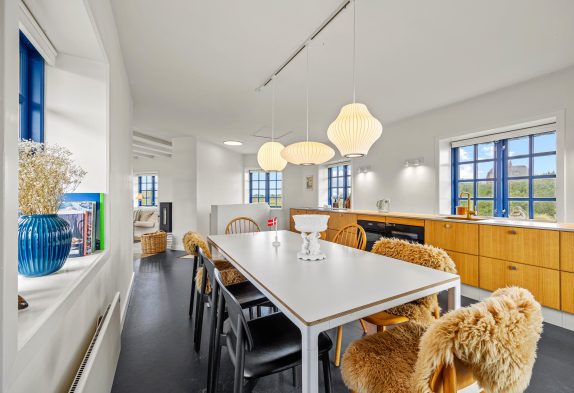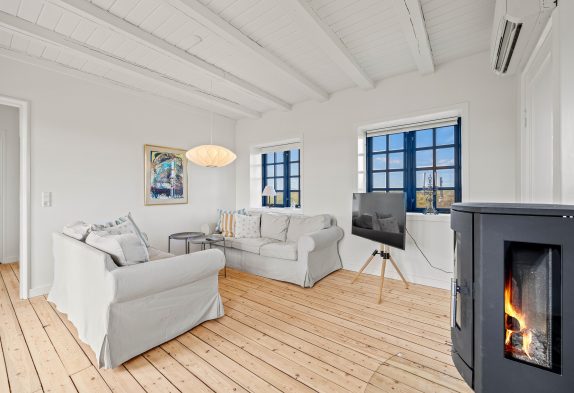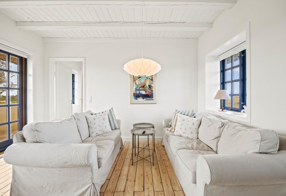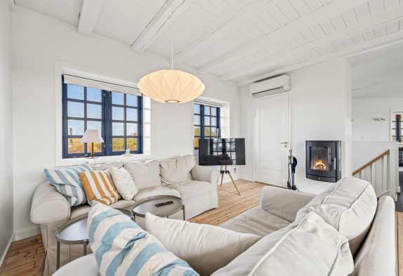 Det smukke stråtækte sommerhus er indrettet med sprossevinduer, synlige bjælker i stuen, bræddeloft og møbler i en dejlig lys sommerhusstil. I opholdsstuen et spisebord med hyggelige siddepladser, sofagruppe og en brændeovn. Her kan I holde en filmaften eller en spilleaften sammen. Sommerhuset er indrettet så man kan være to familier.