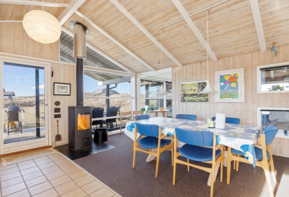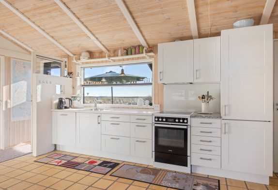 Køkkenet er fuldt udstyret med alle de faciliteter, du behøver for at tilberede lækker mad, og der er også en spiseplads med plads til alle. Her er brændeovnen også placeret, så det sikres at den fordeler varmen bedst muligt i alle rum og skaber den lune, afslappende stemning.