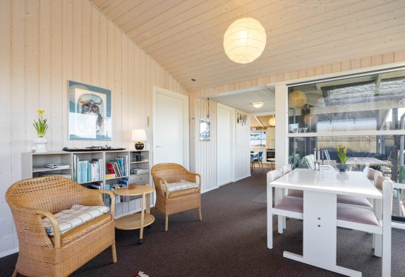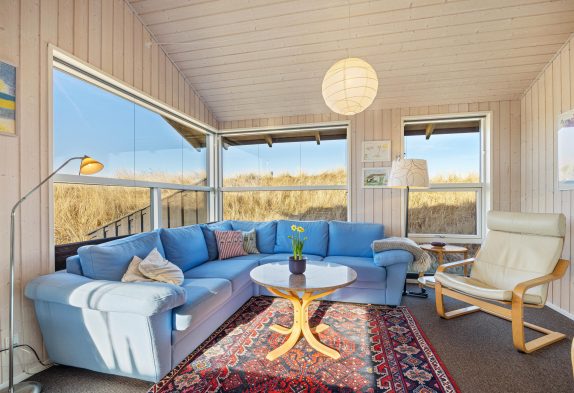 Sommerhuset er indrettet med alt, hvad du behøver for at føle dig hjemme. Stuen er rummelig og indbydende med store vinduer, der giver masser af naturligt lys og en fantastisk udsigt til det smukke landskab udenfor. Der er en behagelig sofa og lænestole, hvor du kan slappe af med en god bog eller se en film på TV’et. Til stuen er også et lille spisebord, hvis nogen ønsker at lade fx. puslespillet ligge fremme, imens der stadig kan dækkes op i det gode køkken der både er med opvaskemaskine og Airfryer.