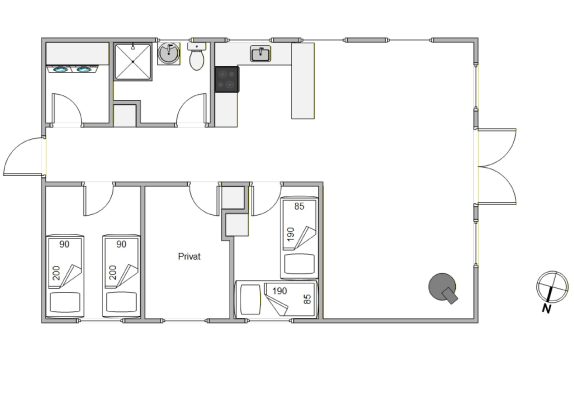 Der er 4 sovepladser fordelt i 2 hyggelige rum. Alle værelser er udstyret med 2 enkeltsenge hver. Sommerhuset har også 1 badeværelse, hvor der er gulvvarme, så I ikke skal fryse fødderne på de køligere dage.