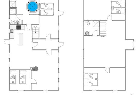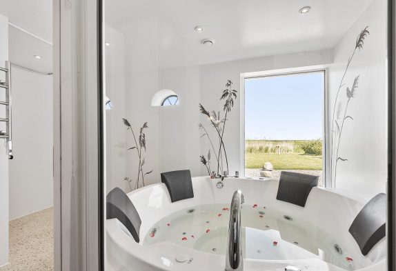 Feriehuset er desuden udstyret med tre badeværelser, naturligvis alle med gulvvarme. I det store badeværelse finder I en luksuriøs wellness-oase med boblebad, hvor I kan lade batterierne op efter en begivenhedsrig dag på stranden. Derudover finder I i planløsningen fire soveværelser i huset, hvoraf tre soveværelser er udstyret med dobbeltsenge og det fjerde værelse har to enkeltsenge.