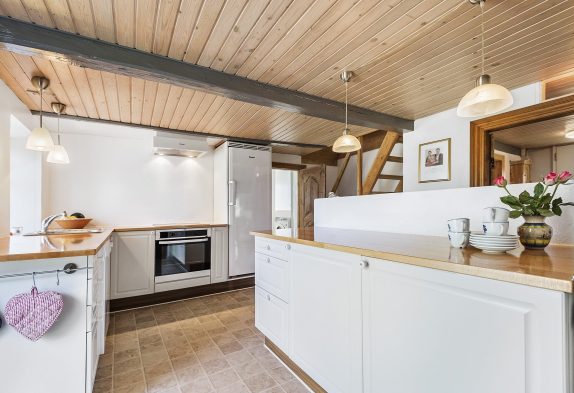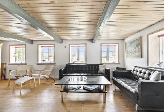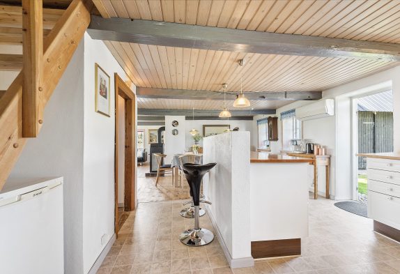 På feriehuset første sal finder I også et billardbord og et bordfodboldbord, som er perfekt til turneringer eller sjov hele året rundt, hvis vejret ikke er helt med jer. På første salen er et skønt naturligt lysindfald, her er loft til kip og fritlagte bjælker. Et helt perfekt fællesrum, hvor I kan nyde hinandens selskab og feriestemningen.