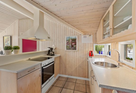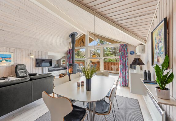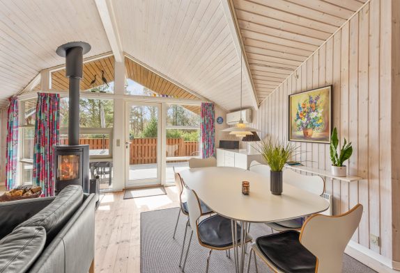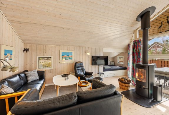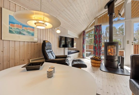 Det lille køkken, med gulvvarme, er åbent i forbindelse med spiseplads og sofagruppe. Her er alt, hvad I behøver for at tilberede lækre måltider, hygge jer foran brændeovnen ved spisebordet eller i sofaen med en god bog og en kop kaffe. Her er endda en alkove, hvis du får brug for et hvil midt på dagen. Sommerhusets mange vinkler og kroge i sammensætning med de lyse, træbeklædte vægge og lofter op i kip giver luft, hygge og feriestemning. På kølige dage eller mørke aftener er det nærliggende at tænde op i brændeovnen, lægge fødderne op og hygge sig sammen om et spil yatzy og et glas vin.