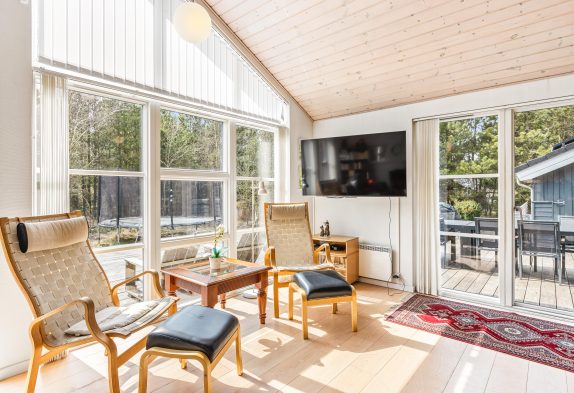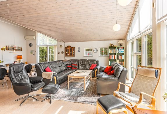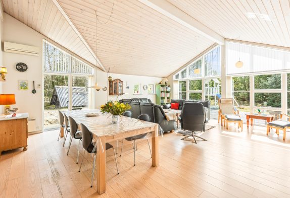 Jeres sommerhus på Dværgternen 7 har meget at byde på, både inde og ude. Feriehusets centrum er den rummelige stue, der med sine mange vinduer og høje lofter fremstår lys og hyggelig. Både fra spisebordet og fra sofagruppen kan I nyde udsigten på den smukke omkringliggende natur.