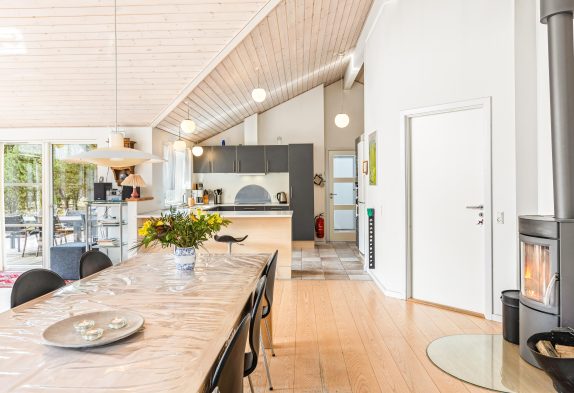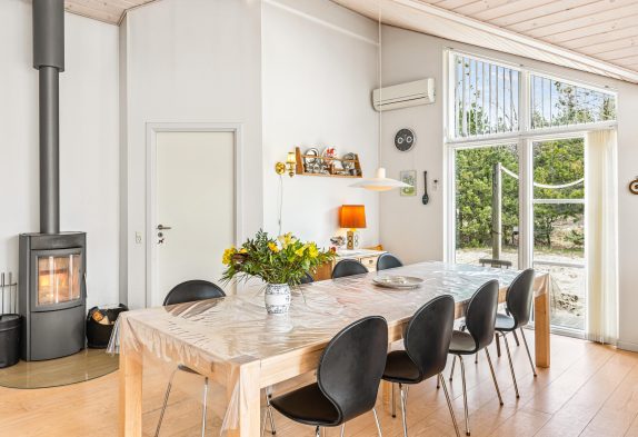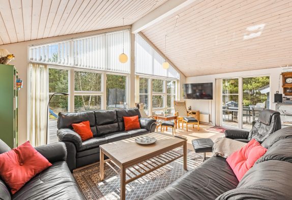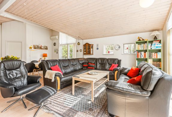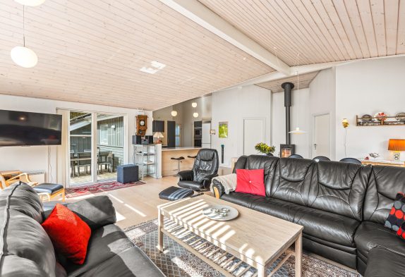 De komfortable sofaer er det perfekte sted til at lave en filmaften med hele familien, hvor I samles til hygge med hjemmelavet popcorn og brændeovnens omfavnende varme. Derudover kan I varme feriehuset op med den energibesparende varmepumpe.