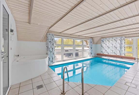 Fra alrummet er der indgang til rummet med både pool og spa. Her indbydes der til timevis af sjov både for små og store. Mens de mindste kan plaske rundt i poolen, kan de voksne sætte sig og læne sig tilbage i den boblende spa. Fra poolrummet er der også udgang til den store naturgrund, som feriehuset er beliggende på.