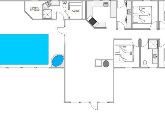 Det store sommerhus med stråtag på Godthåbsvej 7 er dejlig stort og rummeligt. Her er der 4 gode soverum med behagelige senge samt 2 badeværelser med gulvvarme. På det ene badeværelse, som befinder sig i poolrummet, er der også en sauna, hvor I kan sidde og dampe af efter en dejlig og begivenhedsrig dag på Rømø.