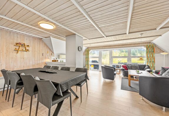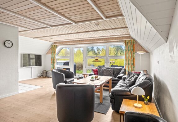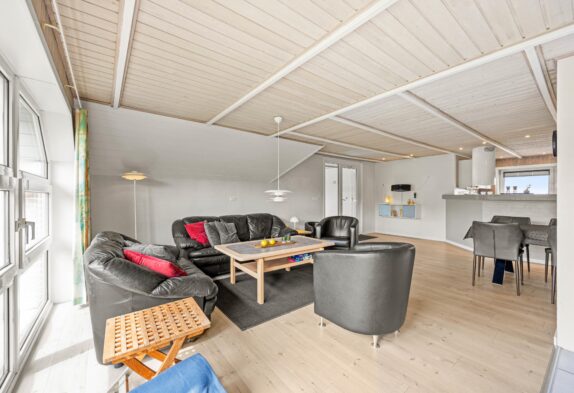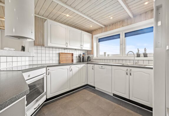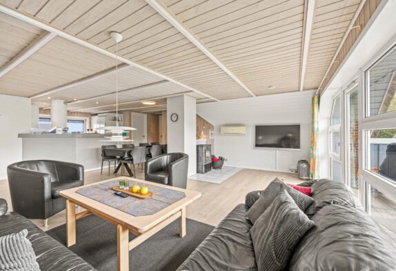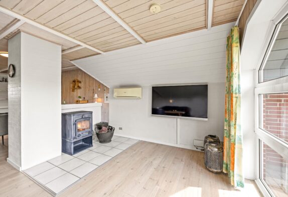 Fra hoveddøren træder I ind i sommerhusets entré, hvor både vaskemaskine og tørretumbler befinder sig. Herefter træder I ind til køkkenet og spisestuen. I den åbne stue, som ligger i forbindelse med det dejlige køkken, kan I sætte jer om aftenen og hygge jer med brætspil og varmen fra den skønne brændeovn. I kan også opvarme sommerhuset med den energibesparende luft til luft varmepumpe.
