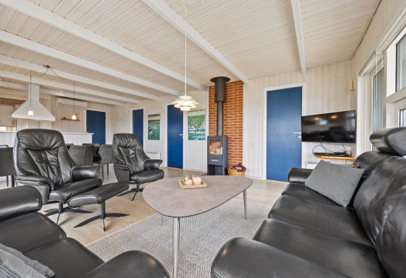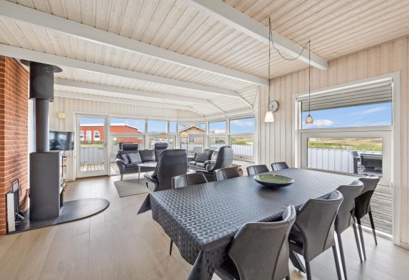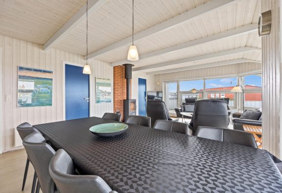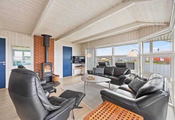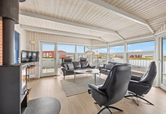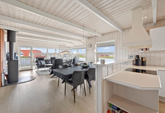 Dette dejlige sommerhus på Rømø byder på en charmerende og behagelig indretning. Fra entréen, med både vaskemaskine og tørretumbler, kommer I ind til køkkenet og alrummet. I det åbne og praktiske køkken kan I lave mad sammen, og i stuen kan I slå jer ned i de behagelige møbler med den knitrende brændeovn i baggrunden. Herfra kommer et dejligt lysindfald fra det store vinduesparti.