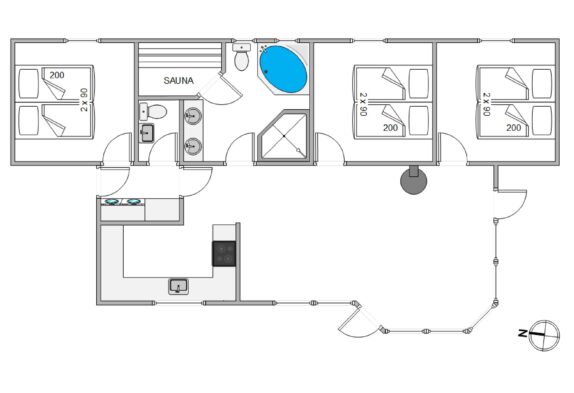 Sommerhuset har 3 gode soverum samt et dejligt badeværelse med gulvvarme, sauna og spa. Her er der altså rig mulighed for en masse afslapning. Sommerhuset har også et ekstra gæstetoilet, så der ikke er kø til badeværelset om morgenen.