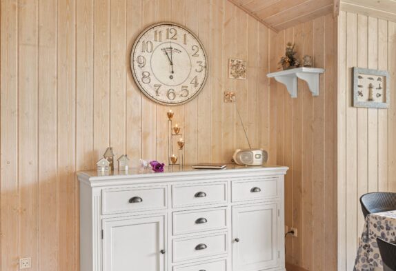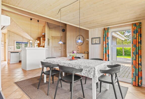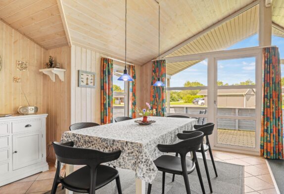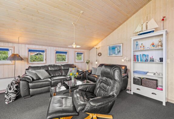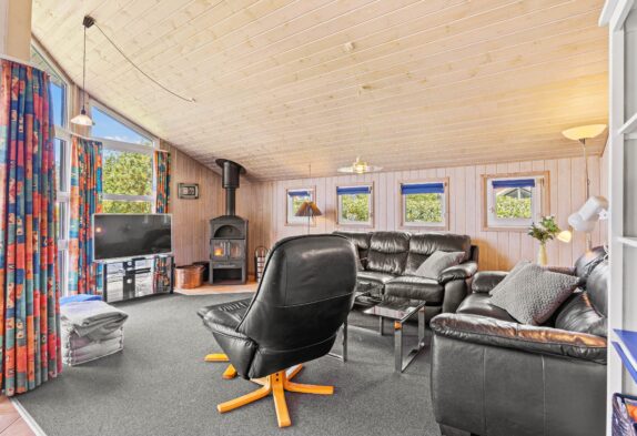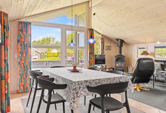 I stuen er der et stort vinduesparti, som giver en masse sollys og en dejlig udsigt til det fri. Her er gode og hyggelige siddepladser, hvorfra I kan se dagens nyheder på tv’et eller læse en bog i fred og ro. Tænd op i brændeovnen, mærk varmen sprede sig gennem sommerhuset og lad jer fortrylle af de dansende flammer.
