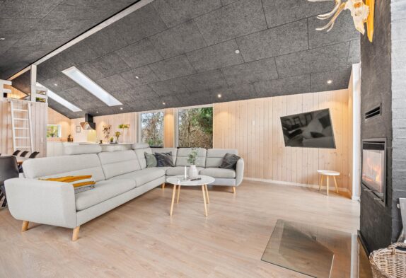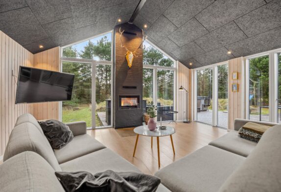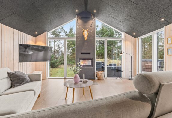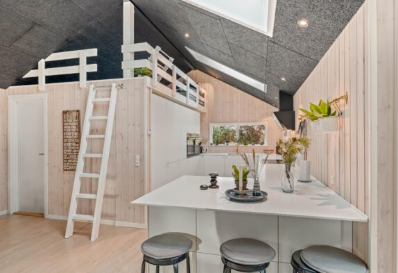 Om aftenen kan I samle jer i sofaen, lytte til den knitrende ild i pejsen og nyde stemningen i fulde drag. Fra opholdsstuen kan I i øvrigt komme op til et lille plateau via en stige. Et fantastisk sted for børnene at trække sig tilbage, spille spil eller bygge en hule.