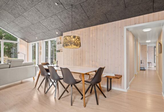 Ved indretningen af værelserne blev der lagt stor vægt på skandinavisk stil, kvalitet og komfort. Denne stil er holdt igennem alle feriehusets rum på Lyngsletten 39. Feriehusets hjerte, den rummelige stue med spisebord og åbent køkken, er et rum, hvor det er en sand fornøjelse at opholde sig i. De store gulv-til-loft-vinduer sørger for et fantastisk lysindfald og byder samtidigt på den flotte udsigt til naturen.