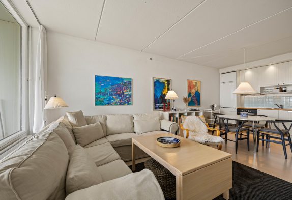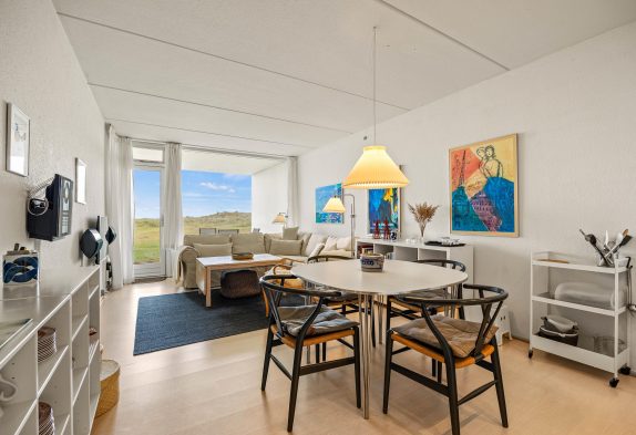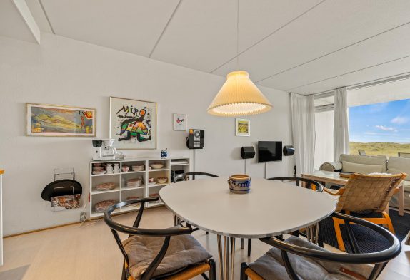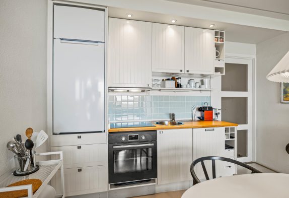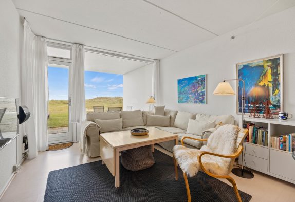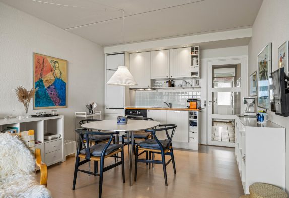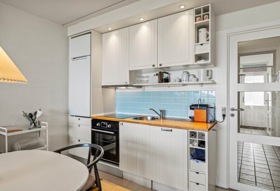 Ferielejligheden har et opholdsrum med komfortable møbler, hvorfra I kan nyde udsigten og hygge med en god bog eller et slag kort ved sofaen eller bare Chromcaste en film. I det overskuelige og veludstyrede køkken er der ud over ovn og kogeplader et køleskab med frostboks samt en opvaskemaskine til rådighed.