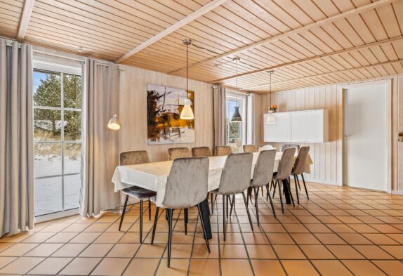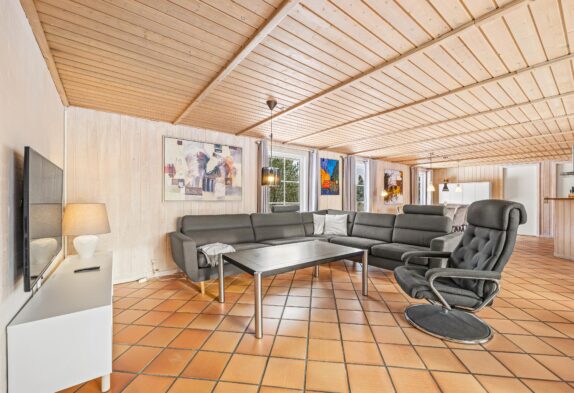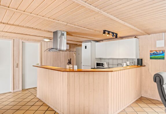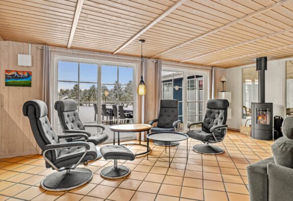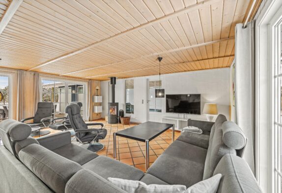 Mellem de 2 fløje med henholdsvis værelser og poolrum ligger alrummet, hvor stue, spiseplads og køkken ligger i åben forbindelse. Her kan I samles til hyggelige stunder med hele familien, mens brændeovnen knitrer i baggrunden. Desuden har sommerhuset en energibesparende varmepumpe, som I med fordel kan benytte jer af.