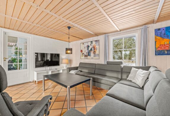 Udendørs er der en skøn terrasse, hvor I kan nyde de solrige dage, mens børnene boltrer sig på den store plænegrund. Her er der både sandkasse og gynge til familiens yngste.