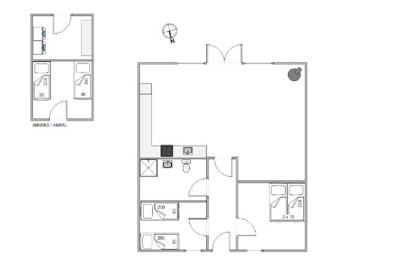 Der er i alt 3 soveværelser, hvor op til 6 feriegæster kan få en god nats søvn. Der er 2 soveværelser i sommerhuset, et med en dobbeltseng og et med 2 enkeltsenge. Det tredje soveværelse ligger i annekset, hvor der er 2 enkeltsenge til rådighed.