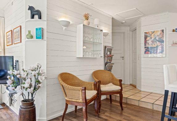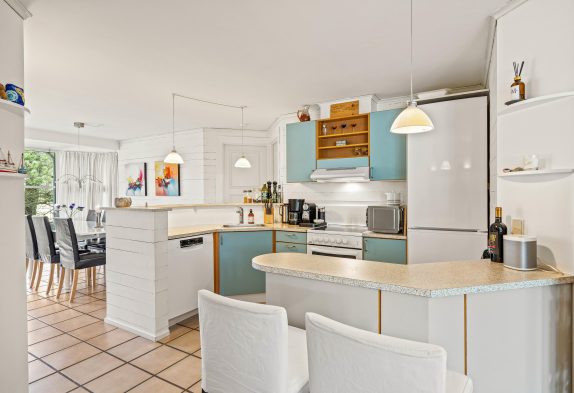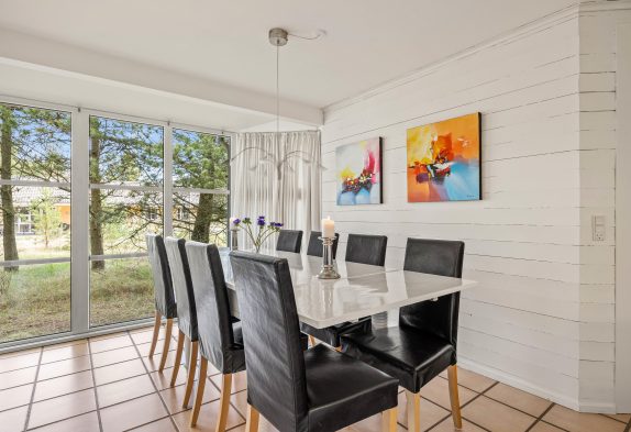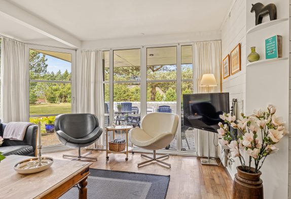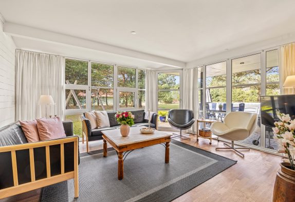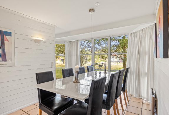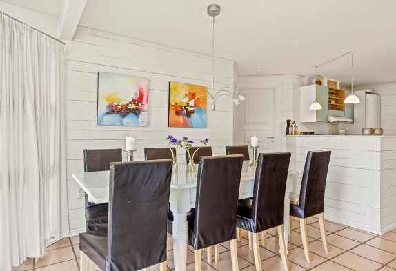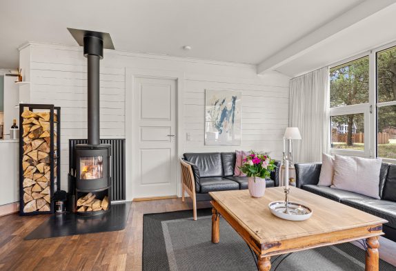 Feriehuset er indrettet med charme – bemærk, at der ingen spildplads er på de 111 m2, og alligevel er her alt, hvad man behøver på en dejlig ferie. Det åbne køkken ligger midt i sommerhuset med spisepladser på den ene side og opholdsstuen på den anden. I køkkenet er alt, hvad I behøver for at tilberede lækre måltider, især lystfiskere vil blive glade for den separate fryser på 80 l. Arranger for eksempel en fiskeaften med et køligt glas hvidvin til. Det er altid hyggeligt at samles omkring et bord – og ved spisebordet sidder man komfortabelt til måltiderne eller til et brætspil. I opholdsstuen med gulvvarme kan I slappe af foran den knitrende ild i brændeovnen, se TV sammen eller læse en god bog og nyde feriestemningen.