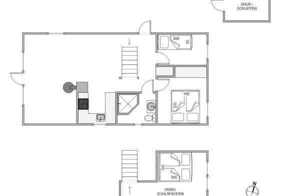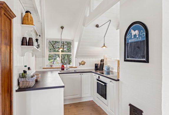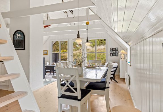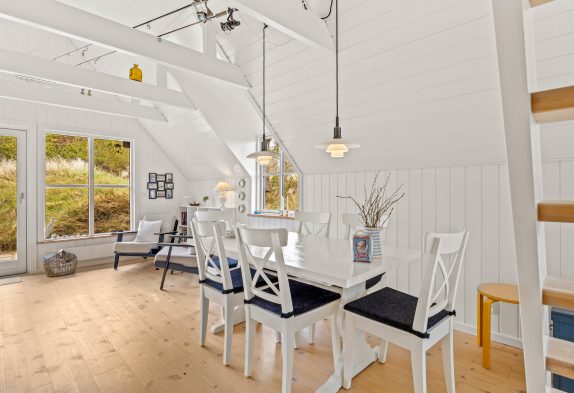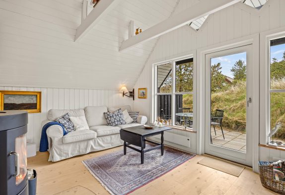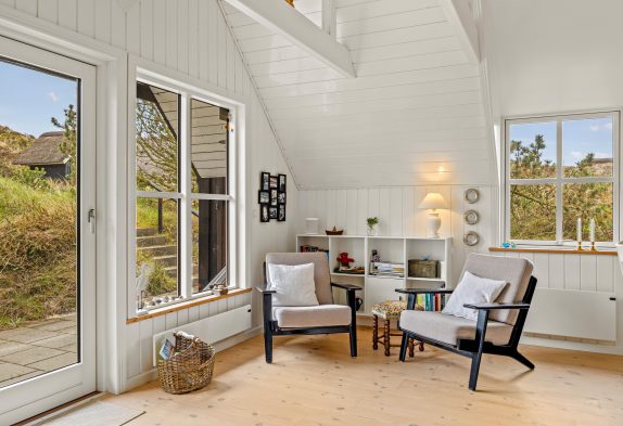 Dette dejlige sommerhus på 59m2 er indrettet yderst praktisk, lyst og med de mange detaljer, kan det ikke undgås, at I under hele jeres ophold vil blive mindet om, at I bor tæt på Vesterhavet. De store vinduer i stuen giver det skønneste lysindfald, også til spisestuen og det veludstyrede køkken. De 3 sovepladser, som dette sommerhus rummer, er fordelt over en dobbeltseng i det ene soveværelse og en enkelseng i det andet soveværelse. Begge soveværelser indeholder et rummeligt højskab til den medbragte garderobe. En trappe i stueetagen fører jer op på hemsen.