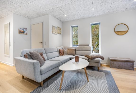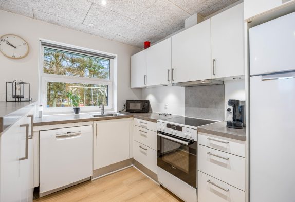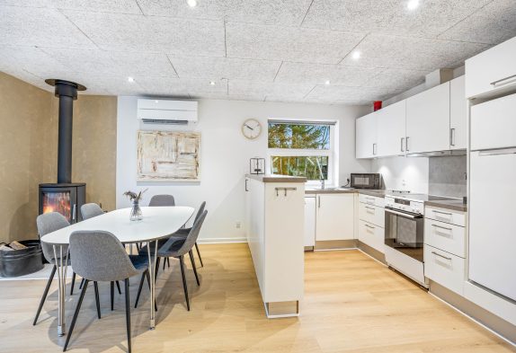 Når du træder ind i sommerhuset, vil du straks bemærke det lyse og moderne køkken, som er indrettet med stil. Det er en fryd at lave mad her, og det er et perfekt sted at samles omkring madlavningen. I stuen finder du en dejlig hyggekrog med brændeovne, der både sikrer varme og hygge på kølige aftener. Forestil dig at sidde foran flammerne og slappe af efter en dag med udendørs aktiviteter. Det er den perfekte atmosfære at skabe gode minder i.