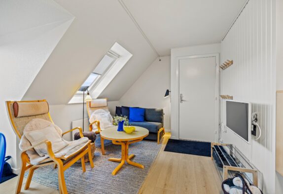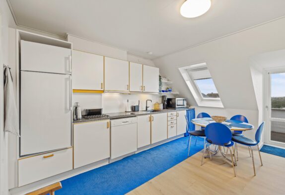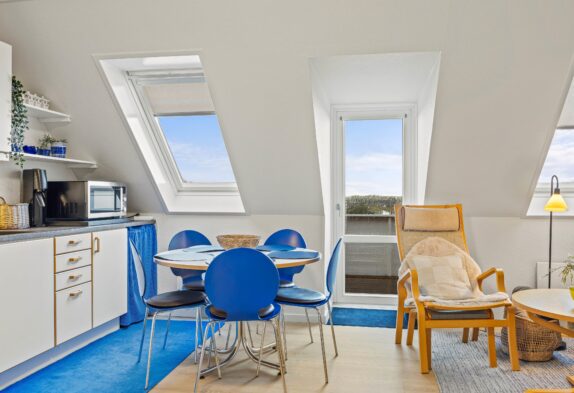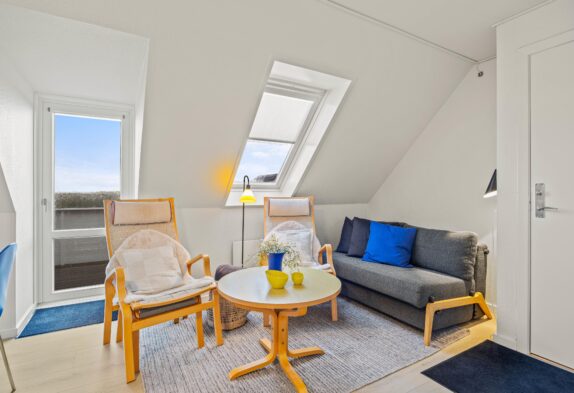På lejlighedens afskærmede terrasse kan I ikke blot nyde Vesterhavets friske luft. Fra lejlighedens terrasse har I en enestående panoramaudsigt over de nære omgivelser, som byder på meget mere end skov og hede. Og når I sidder med jeres morgenkaffe i de komfortable havemøbler på terrassen, vil I helt sikkert kunne høre Vesterhavets brusende bølger i baggrunden.