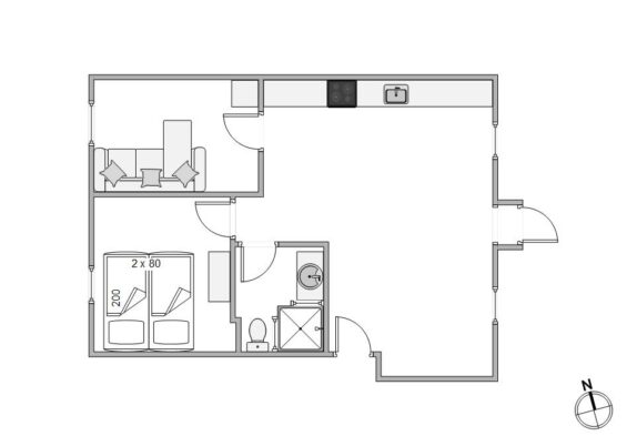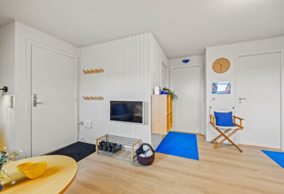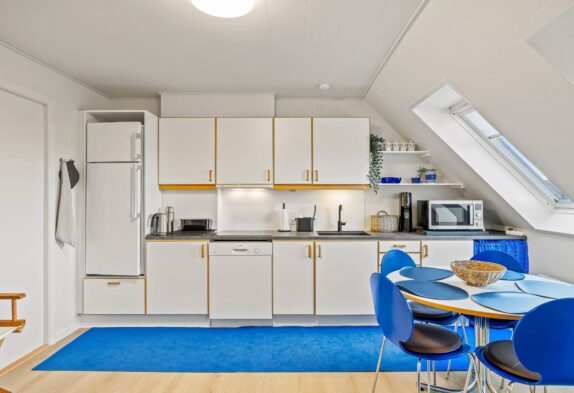 Fra parkeringspladsen fører en trappe jer til den velindrettede lejlighed på 43 m2, som fremstår lys og moderne og byder på alle fornøjeligheder, der hører en badeferie til. Lejlighedens kombinerede stue og spisestue byder op til hygge og samvær. Lejlighedens køkken er veludstyret og indeholder både en kombineret mini-/mikroovn og en opvaskemaskine.
