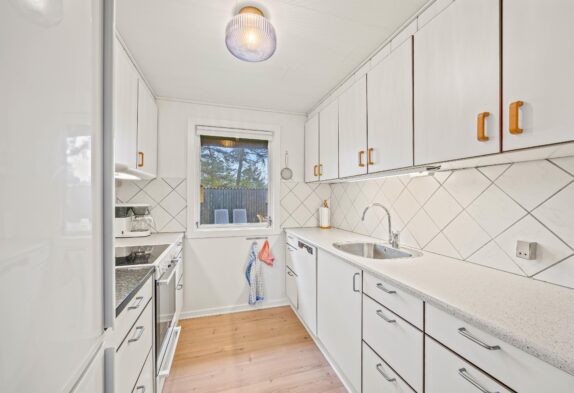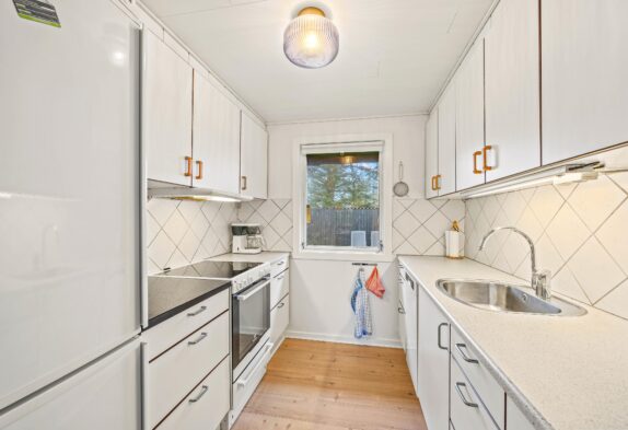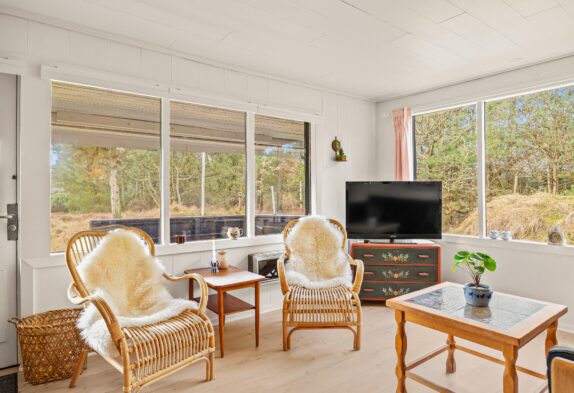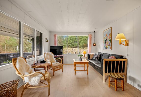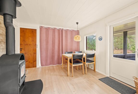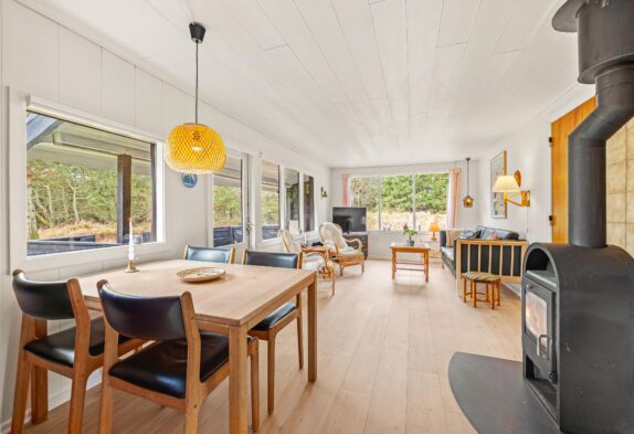 Det sorte feriehus på Ørnevej 38 kan blive den trygge ramme om gode ferieminder, for her er der plads til hygge og samvær. I det pæne hvide køkken kan lækre feriemåltider tilberedes og opvaskeren klarer nemt opvasken. I den kombinerede spisestue og stue kan maden nydes til brændeovnens stemningsfulde og varmende knitren.