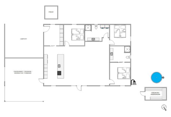 Om aftenen kan I slappe af i feriehusets 3 soveværelser, der alle er udstyret med en dobbeltseng. Feriehuset er udstyret med 2 badeværelser, så der ikke er trængsel foran badeværelset om morgenen. Spejlene på badeværelset er udstyret med en anti damp funktion for at undgå dug.