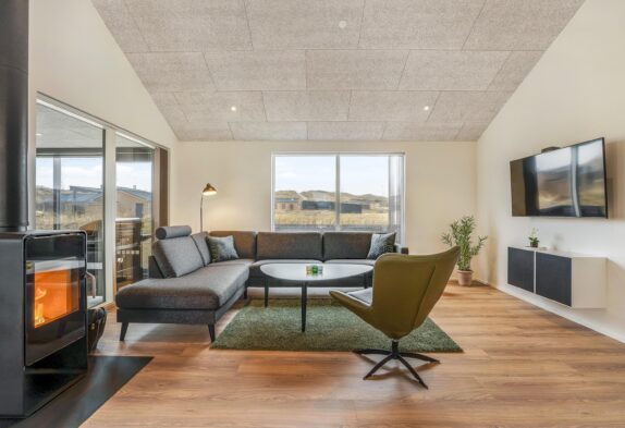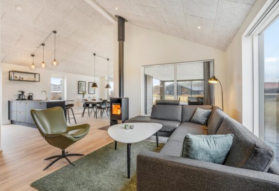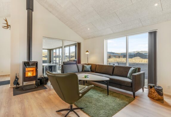 Her har I de perfekte forudsætninger for at slappe af og komme helt ned i gear. De lyse farver skaber en indbydende atmosfære i hele feriehuset, og i alrummet står brændeovnen klar til at danne ramme om hyggelige stunder. Det største af ferieboligens to badeværelser er indrettet med sauna og spabad, så I kan nyde godt af lidt ekstra wellness på ferien. En energivenlig varmepumpe sørger desuden for, at I altid har et behageligt indeklima, også uden de store omkostninger.