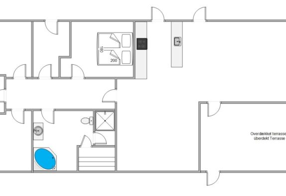 Næsten hele vejen rundt om sommerhuset løber en stor, lækker terrasse med alsidige muligheder for at nyde den friske luft og den flotte natur. Hele terrassen er lukket, og fra stuen træder I ud på en stor, overdækket og afskærmet del, hvor I altid kan finde ly og læ – især praktisk til de hyggelige grillaftener. Her finder I også en udebruser, så I kan skylle jer efter en tur på stranden (kan benyttes fra april til november).