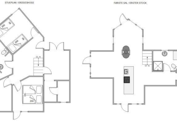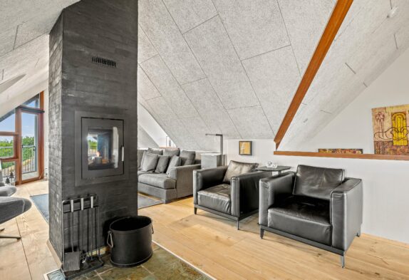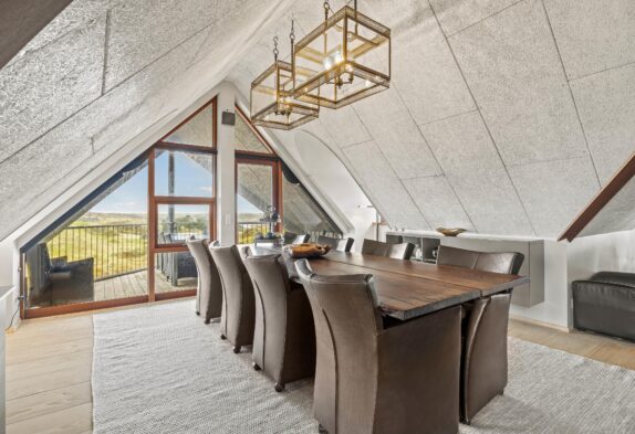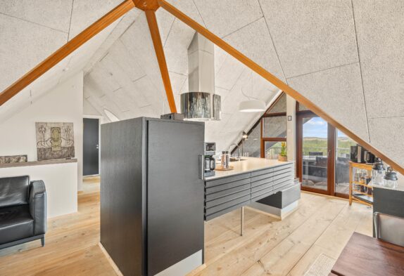 Køkken og stue med brændeovn er placeret på førstesalen, hvorfra der ligeledes er udgang til de skønneste altaner, hvor du kan byde hver eneste feriedag velkommen med en kop friskbrygget morgenkaffe, mens solen står op og bader klitlandskabet og Vesterhavet i lys.