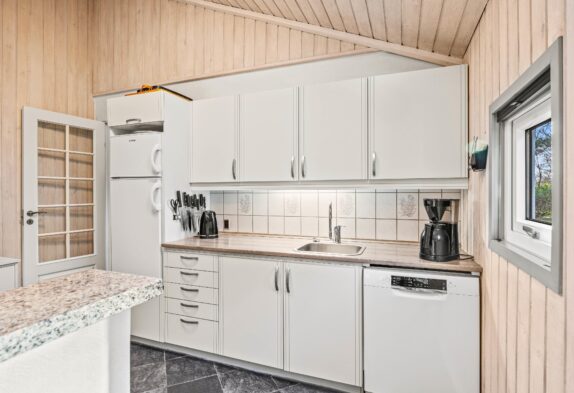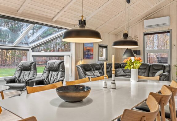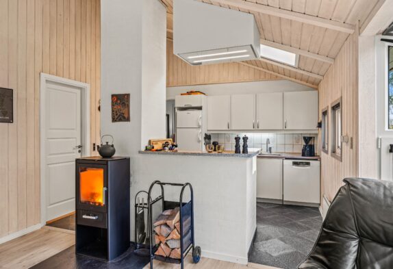 I det lyse opholdsrum, hvor stue, køkken og spisestue er samlet, kan I nyde hinandens nærvær, mens I hver især laver noget forskelligt og nyder den knitrende varme fra brændeovnen – nogle lægger måske puslespil ved spisebordet, mens andre spiller kort i lænestolene, læser en god bog i sofaen, eller står i køkkenet og tryller lækre feriemåltider frem og deltager i samtalen. Opvaskemaskinen sørger for at tage opvasken, mens vaskemaskinen og tørretumbleren får yndlingstrøjen ren igen efter aftenens spaghetti bolognese, som altid har en tendens til at sætte sig på sweateren.