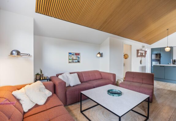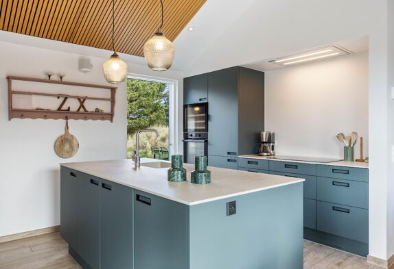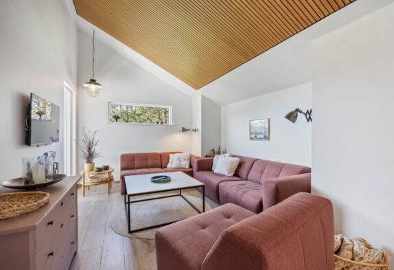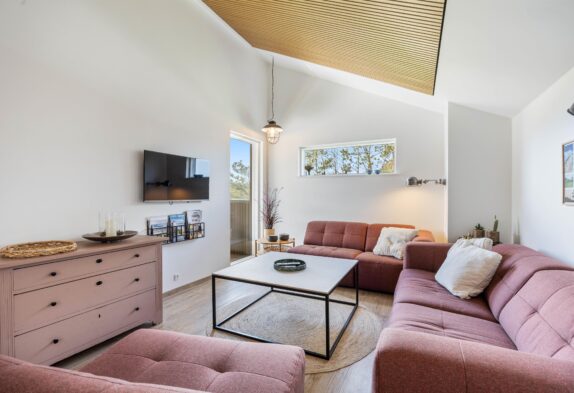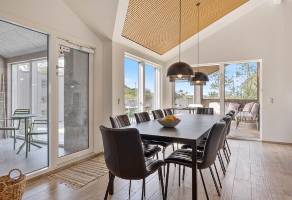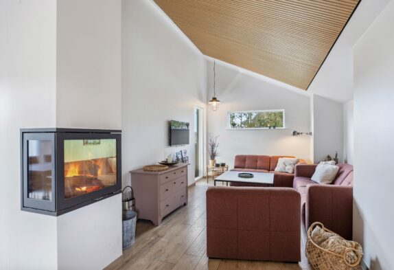 Sommerhuset er overalt lyst, med rengøringsvenlige klinkegulve og gulvvarme, store vindue og komfortable møbler. Familiens samlingspunkt bliver det åbne alrum i forbindelse med stuen. I det åbne, flotte køkken kan I kreere et dejligt måltid, som samler familien om det lange spisebord. Til maden kan I åbne en god flaske vin, der er blevet dejlig kold i vinkøleren. Både omkring bordet og i sofaarrangementet kan I få glæde af den knitrende brændeovn, som er placeret centralt i rummet. Find slikket frem og se en god film i fjernsynet, mens varmen breder sig.