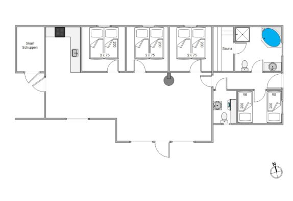 Her er 8 sovepladser, som er fordelt på 4 soveværelser. 3 af soveværelserne er indrettet med en dobbeltseng og det fjerde soveværelse har 2 enkeltsenge. På badeværelset finde I både en sauna og spa – her kan I komme helt ned i gear og rigtig blive varmet igennem efter en afslappende gåtur på de mange små stier, der er at finde her i Jegum Ferieland.