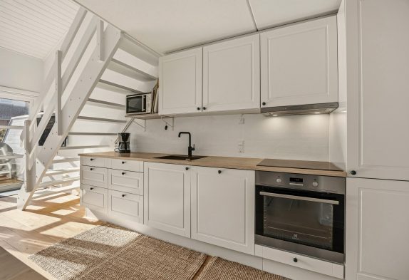 Badeværelset er udstyret med bruser og gulvvarme, som sørger for lune fødder. I stueplan ligger feriehusets hjerte, som er den fine opholds- og spisestue med integreret køkken med opvaskemaskine. Her kan I hygge jer foran fjernsynet med en god film eller samles omkring spisebordet med et hyggeligt brætspil.