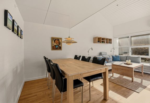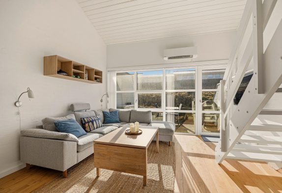 Fra opholdsstuen er der direkte udgang til den sydvendte terrasse, hvor I kan tilbringe solrige dage sammen. Terrassen er både lukket og afskærmet, så I kan slappe af og nyde den friske havluft og duften af klitroser i fred og ro. Terrassen er udstyret med komfortable havemøbler og parasol – og råder naturligvis også over en grill, så familiens grillmester kan fremtrylle lækre måltider.