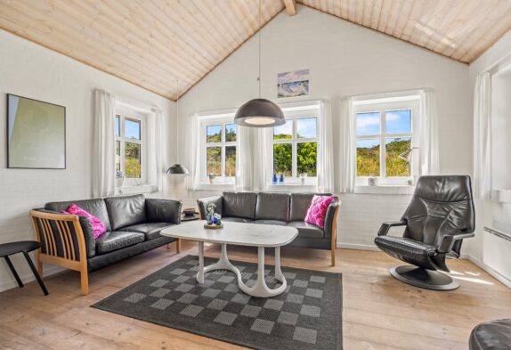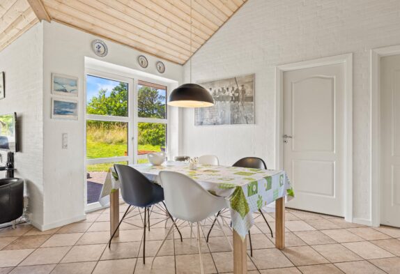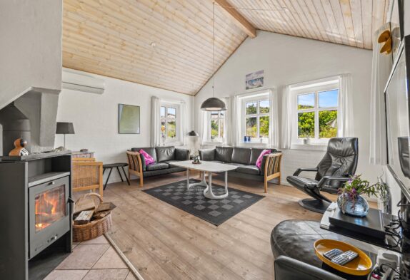 Sommerhuset på Porsevej 30 kan rumme op til 6 gæster og er med sine 115 m2 velegnet til familieferien, og med mulighed for at medbringe to hunde. Her er lyst, højt til loftet og en skøn indretning holdt i rolige nuancer. Hjerterummet og feriehusets samlingspunkt er det store alrum, der kombinerer køkken, stue samt spiseområde. Her kan I sammen lave mad, spille brætspil og meget andet! Brændeovnen* sørger for den gode stemning, og I kan med fordel gøre brug af den energibesparende varmepumpe.