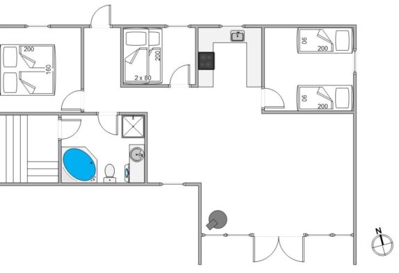 Sommerhuset har tre komfortable soveværelser. Det ene soveværelse er indrettet med en 160’er dobbeltseng. De to andre soveværelser er udstyret med to enkeltsenge og en køjeseng, hvilket gør dem perfekte til børnefamilier. Badeværelset er udstyret med gulvvarme og inkluderer en tømmespa til to personer for ultimativ afslapning. Som et ekstra element af luksus findes der også en sauna.